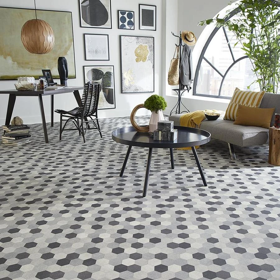 This bold, arresting floor—with its classic monochromatic look—is an ideal complement to contemporary, modern or mid-century modern dcor